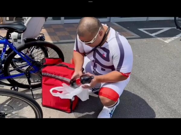 ビブパンツから汗で蒸れた仮性チンコをおったて出してエロエロ宅配、変態デリバリー!