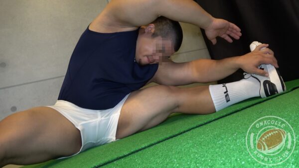 坊主髭大吾170cm 106kg 25歳デカいガタイはラグユニがピチピチ。今日も練習終わりストレッチをしムラムラしだした大吾は抜いて帰ることに。電マを当てると即勃起しラグパン脱いでもっこりビキニに擦り付ける。ビンビン太マラがいきり勃ち、マンコオナホを取り出し正常位と騎乗位でチンポで突き擬似セックスを始める!締め付けが気持ちいい「ヤバ!イキそうだった…」早漏大吾は早くもイキそうになる。